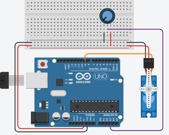 إنجاز دارة كهربائيّة تحتوي على لوحة أردوينو و محرّك سيرفو ومقاوم متغيّر 100 أوم