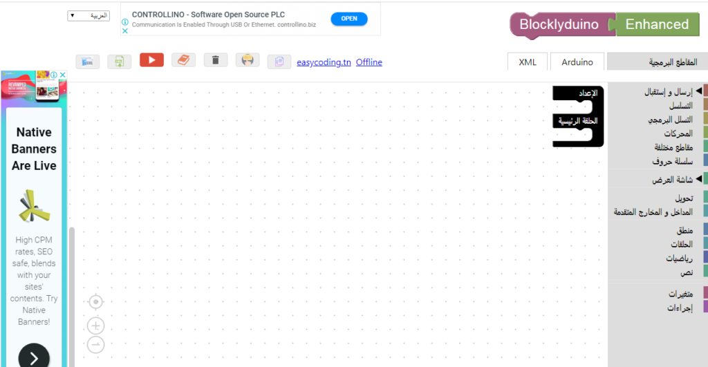عند الضغط على صفحة BlocklyDuino تظهر لنا هذه الصفحة