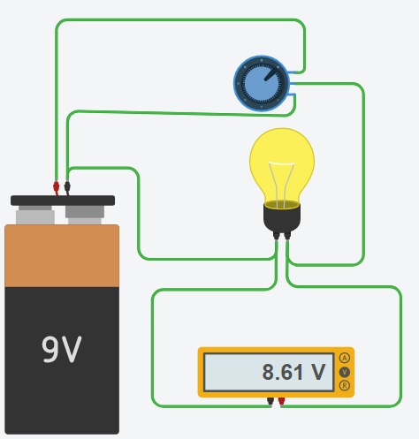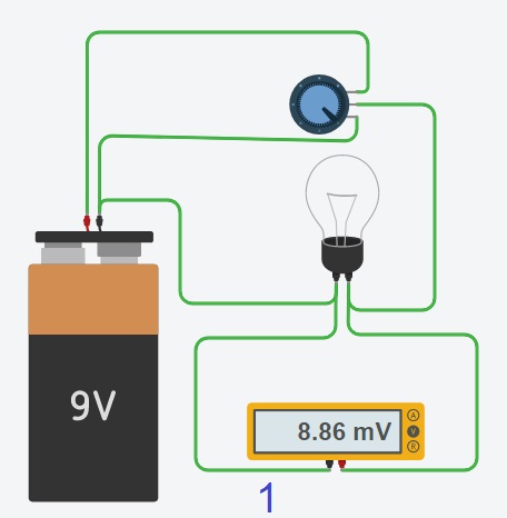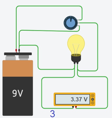 دارة كهربائيّة تحتوي على بطّارية 9 فولط و مصباح و مقاوم متغيّر500 أوم